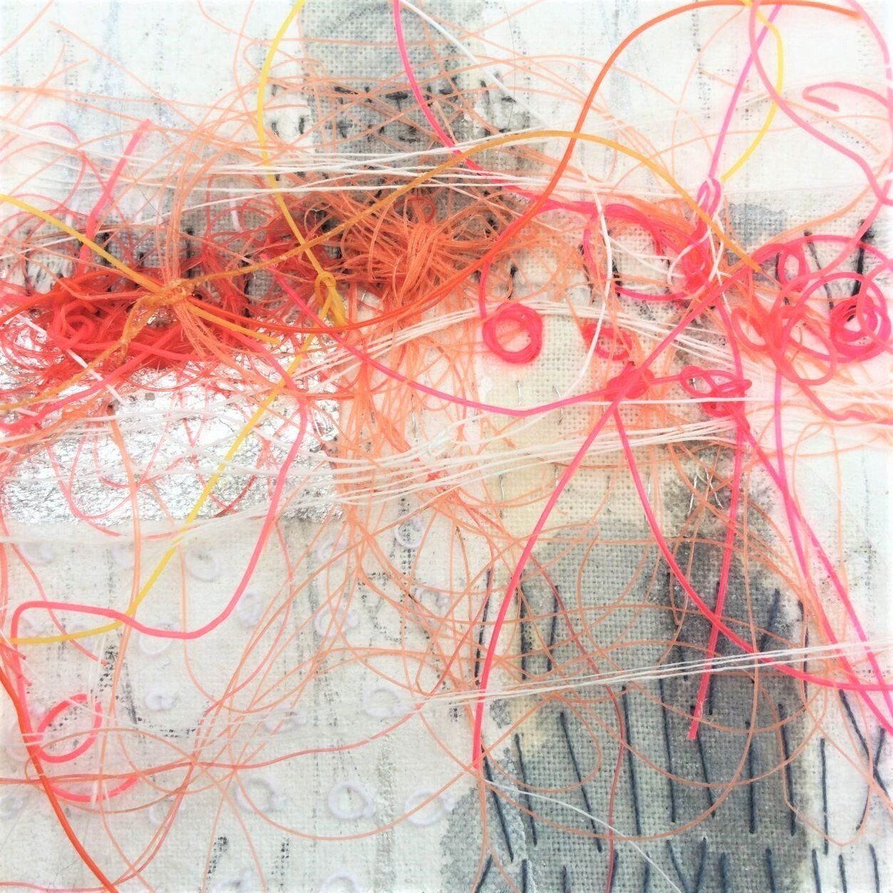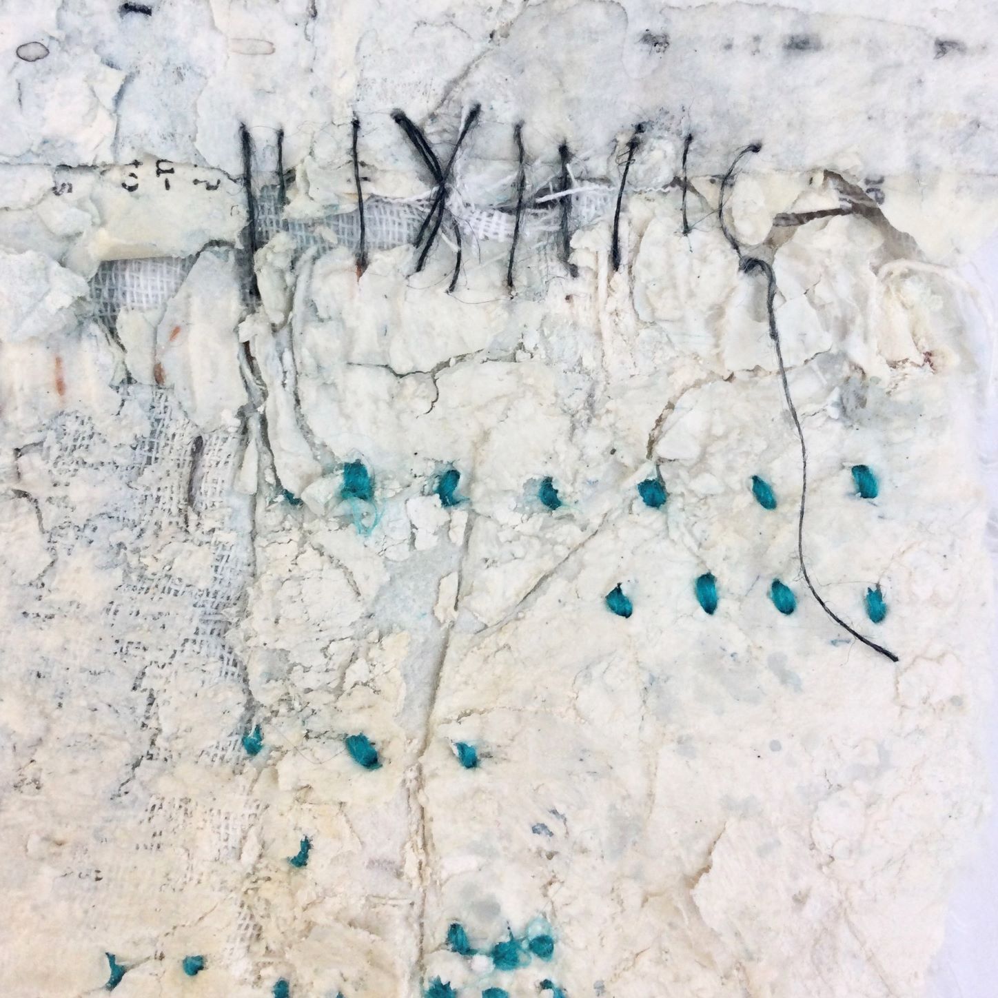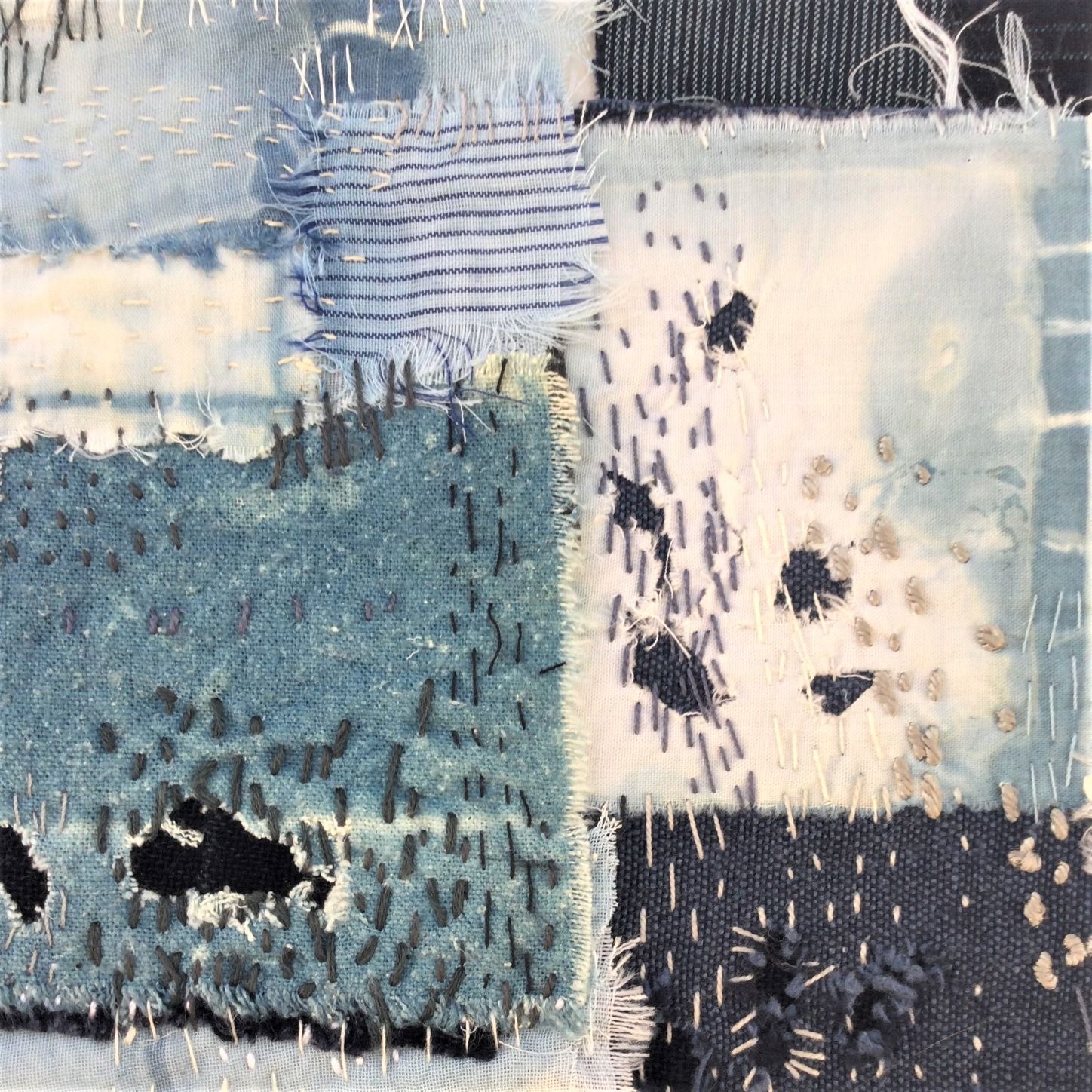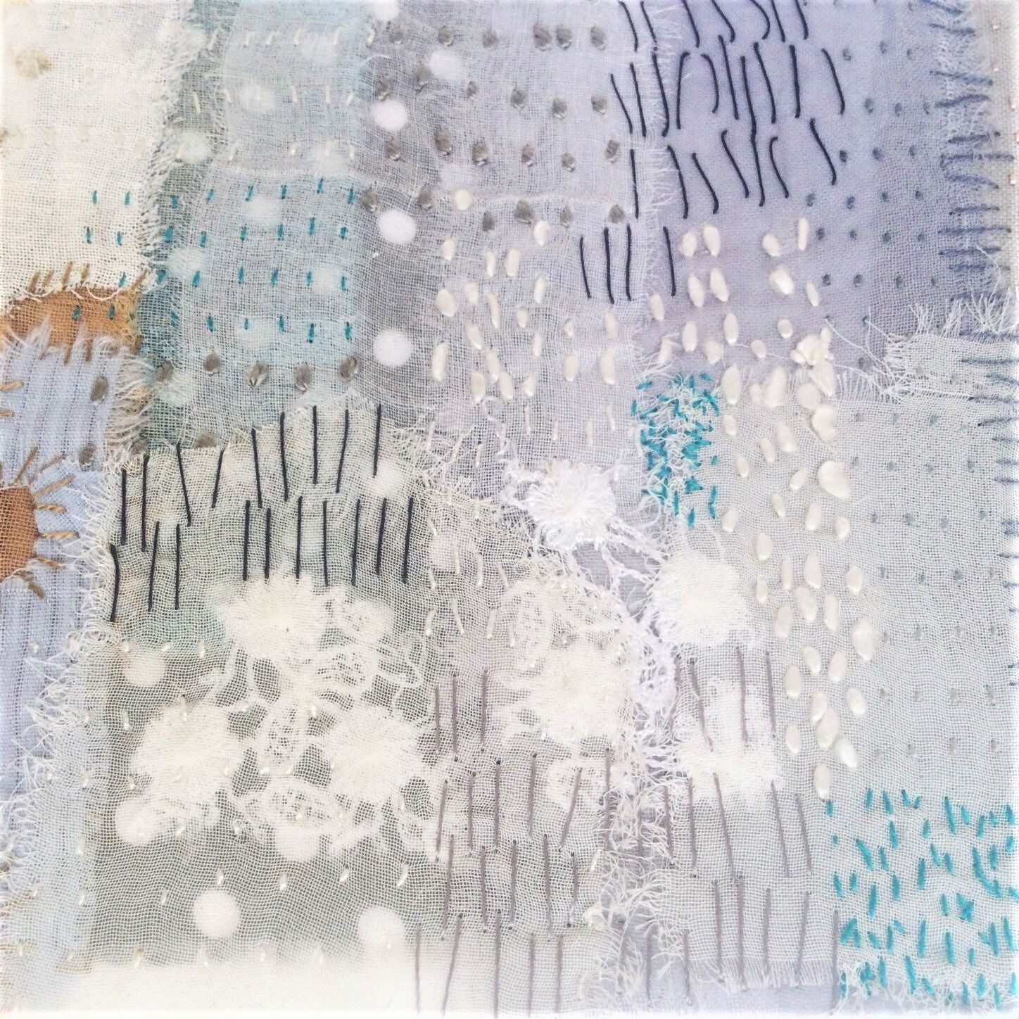 Stitch is used to join but also creates another layer of marks often relating to her drawings. Her textile work takes inspiration from Kantha making and Japanese Boro in which she combines layers of distressed, pre-used cloth. Techniques of piecing, patching and mending are employed as well as folding and trapping, hiding and revealing.