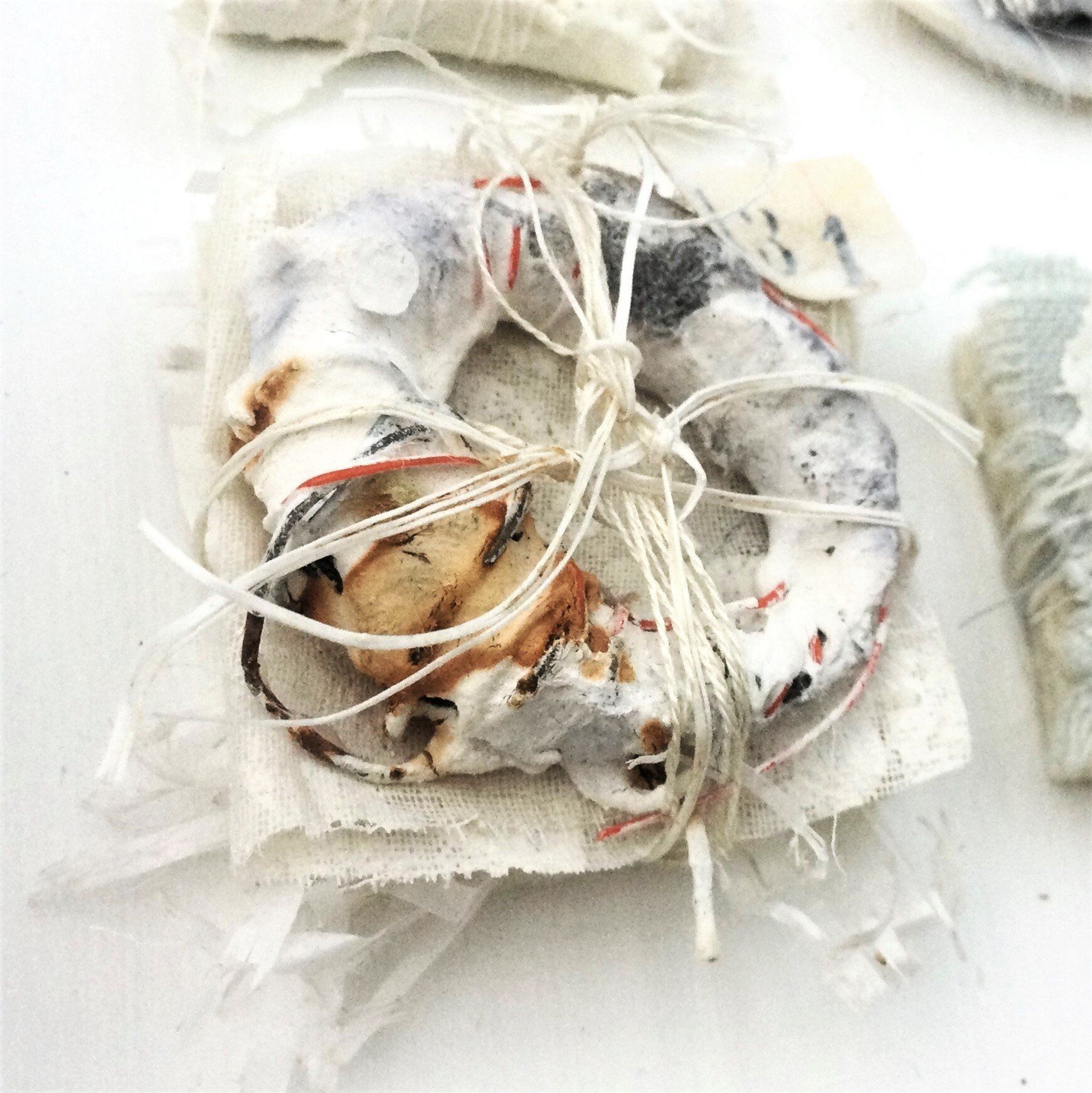 She gathers objects that are weathered, worn, broken and overlooked, observing and responding to small inconsequential things and discarded detritus that may inspire or become part of the finished artwork.
